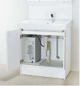 こうやって、洗面台の中に小型電気温水器を設置して解決します。