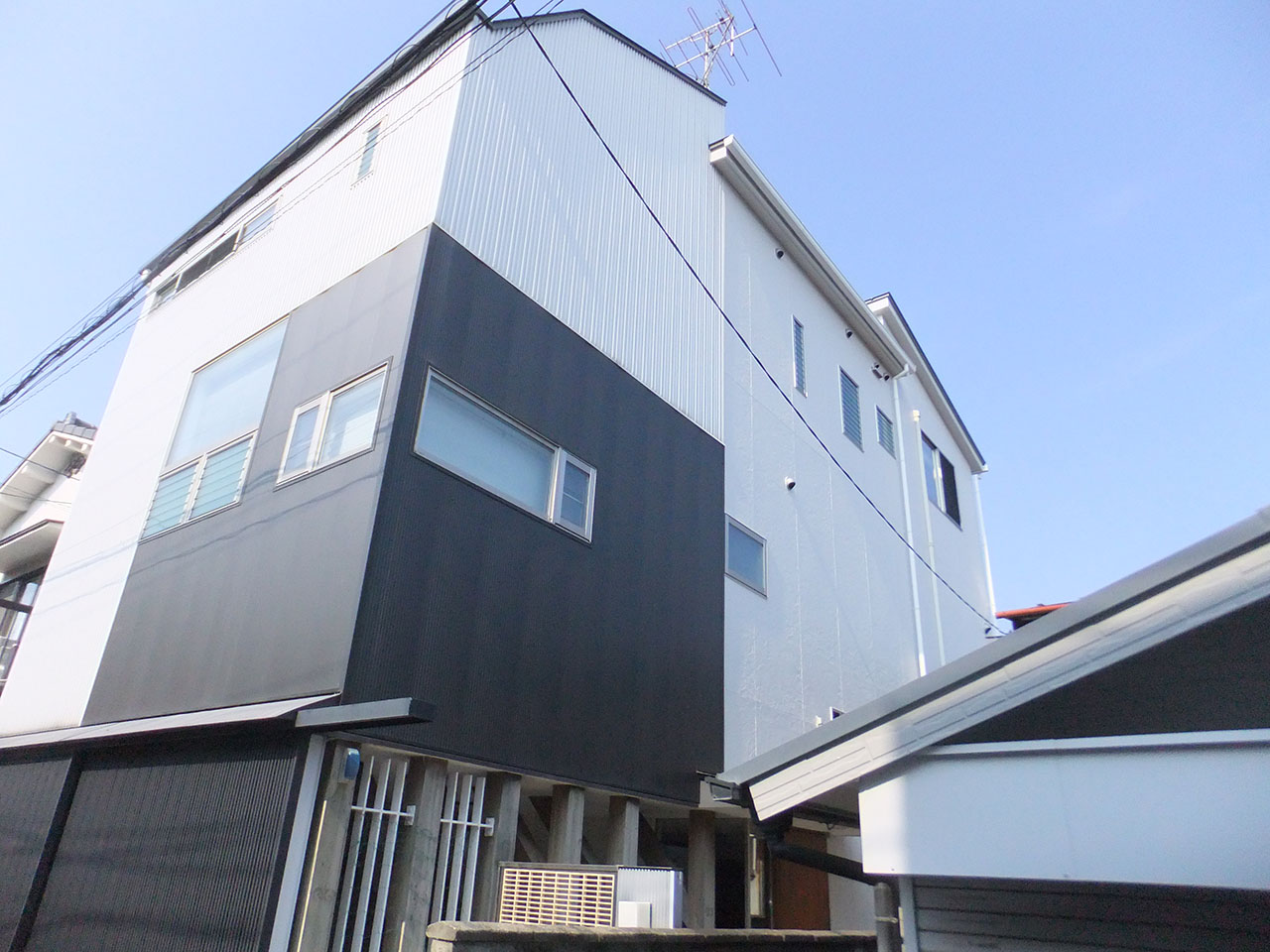 大雨の際に雨漏りがするとのご相談。雨漏りは簡単に直りましたが、点検の結果、外壁のあちこちに損傷があることが判明。洗浄、壁の補修、シーリング打ち替えの後、塗装工事へ。見違えるほど美しい仕上がりになりました。劣化の著しかったお風呂の外壁に、排気よけのステンレス板を設置。次に屋根のメンテナンスが必要な時期まで、外回りは大丈夫です。