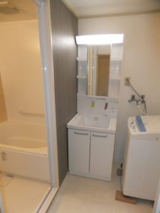 マンションで竣工当時から変えてない、古くなった水回り機器を一新しました。古いマンションは配管も旧式なので、この際最新式の配管にできる限り切り替えます。洗面台には、対汚染性にすぐれた陶器製のボウルの製品をあえて選定しました。