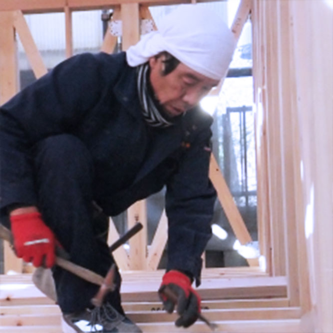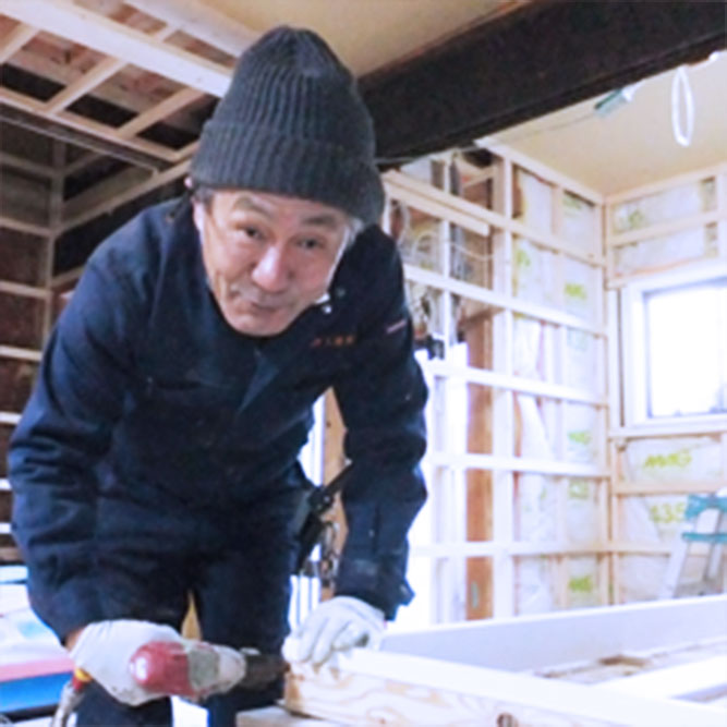 大工歴約40年のベテランです。社長が現場見習いをしていた時にはもう一流の職人でした。明るい性格で現場を和ませてくれます。実は大きくてずんぐりした手の持ち主なのですが、そこから驚くほど細かい作業が生み出されるのが不思議です。